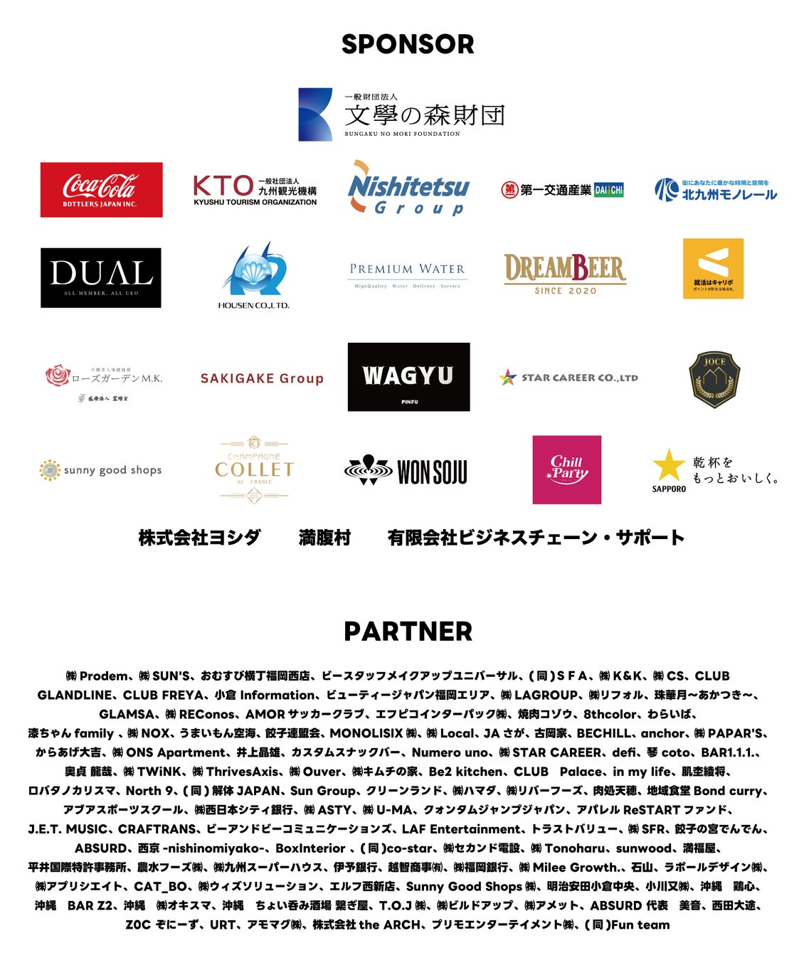 一般財団法人文學の森財団、日本コカ・コーラ株式会社、西鉄バス北九州株式会社、第一交通産業株式会社、北九州高速鉄道株式会社、DUAL、株式会社ヨシダ、株式会社豊泉、満腹村、有限会社ビジネスチェーン・サポート、プレミアムウォーター株式会社、株式会社DREAM BEER、フィリップモリスジャパン合同会社、医療法人翌檜会、株式会社SAKIGAKE Group、株式会社NEXTEIGHT、株式会社STAR CAREER、株式会社ジェオシ―、Sunny Good Shops株式会社、WON SOJU、BE CHILL、COLLET