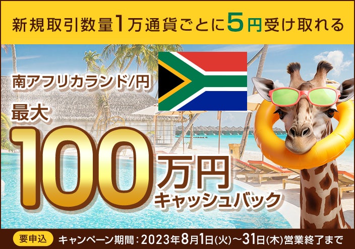 キャンペーンに申し込まれたお客さまに、期間中における南アフリカランド/円の新規取引数量に応じて、最大1,000,000円をキャッシュバックします。