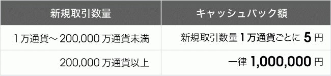 ・新規取引数量が5,000万通貨 ⇒ 25,000円キャッシュバック