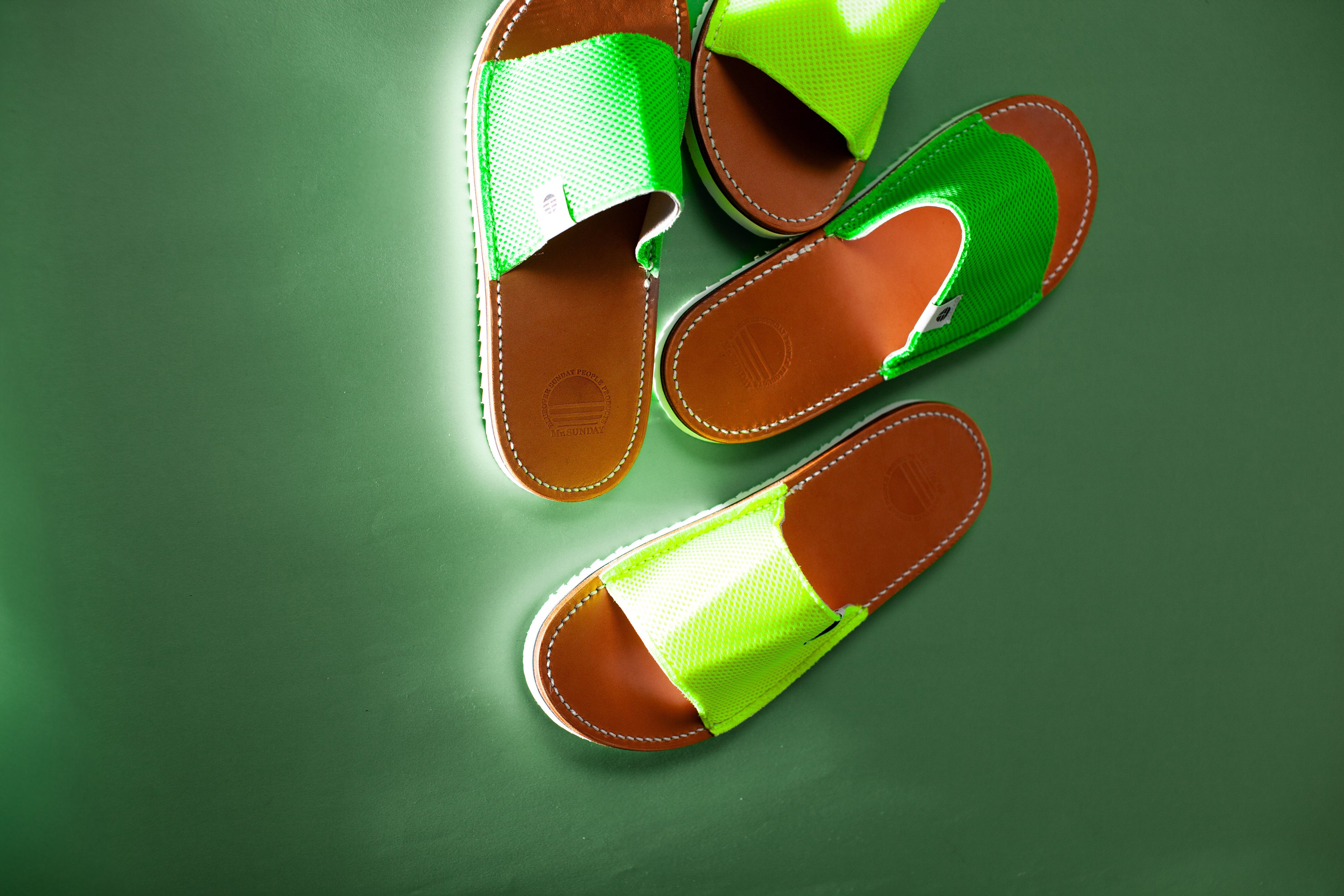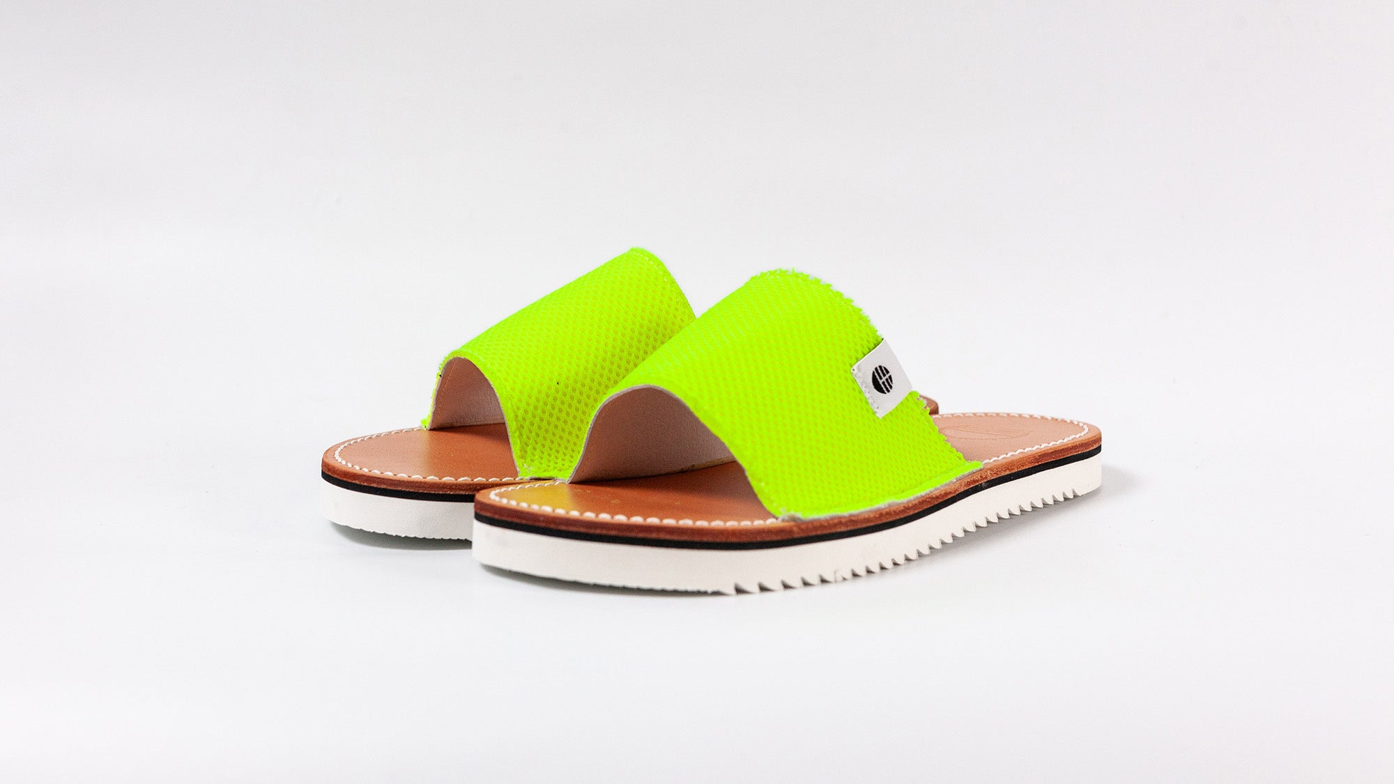 もう一つは夏にふさわしく通気性あるWラッセル生地を使ったモデル。通常のWラッセルより1ミリ厚いこのモデルは日本製の生地を使用。糸にはポリエステルを使用しており、鮮やかなネオンカラーが特徴的となっている。フットベッドとのコントラストが他にない表情を作り出した。