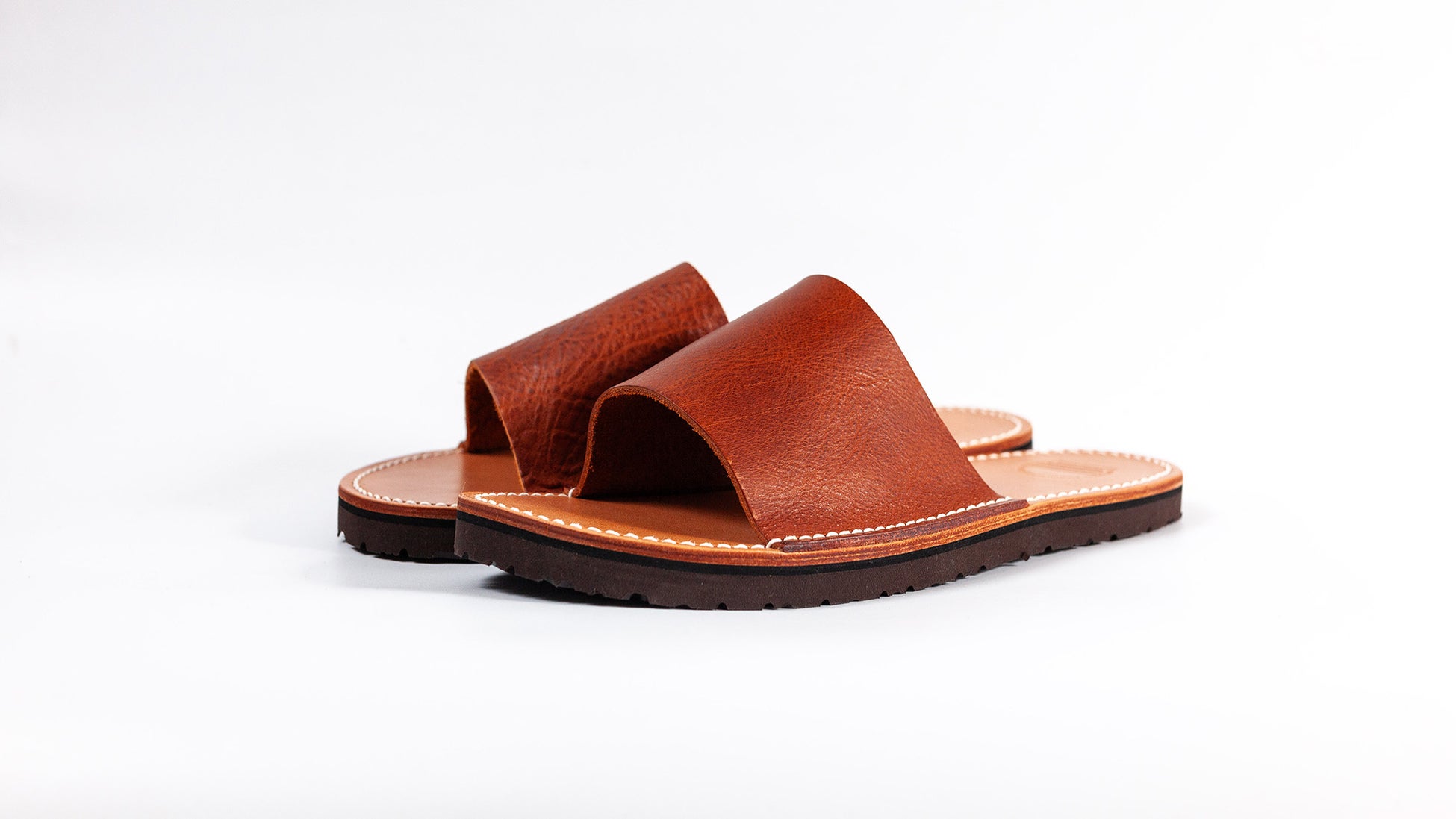フォスコはブルーオーバーから発売されたレザーサンダル。スタンダードなスライドタイプのサンダルながら、フットベッドはショルダーのヌメ革、アッパーはレザー仕様となっており、アッパーとフットベッドを出し縫いで縫い合わせたクラフト感あるサンダル。