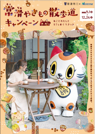 同キャンペーンでは、名鉄電車往復割引乗車券に、常滑やきもの散歩道内の指定店舗で使用できる「カフェ券」などがセットになった「ねことわたしとカフェめぐりきっぷ」を発売します。また、「投稿してハッピー!#ねことわたしとカフェめぐり」 フォトコンテストを実施します。