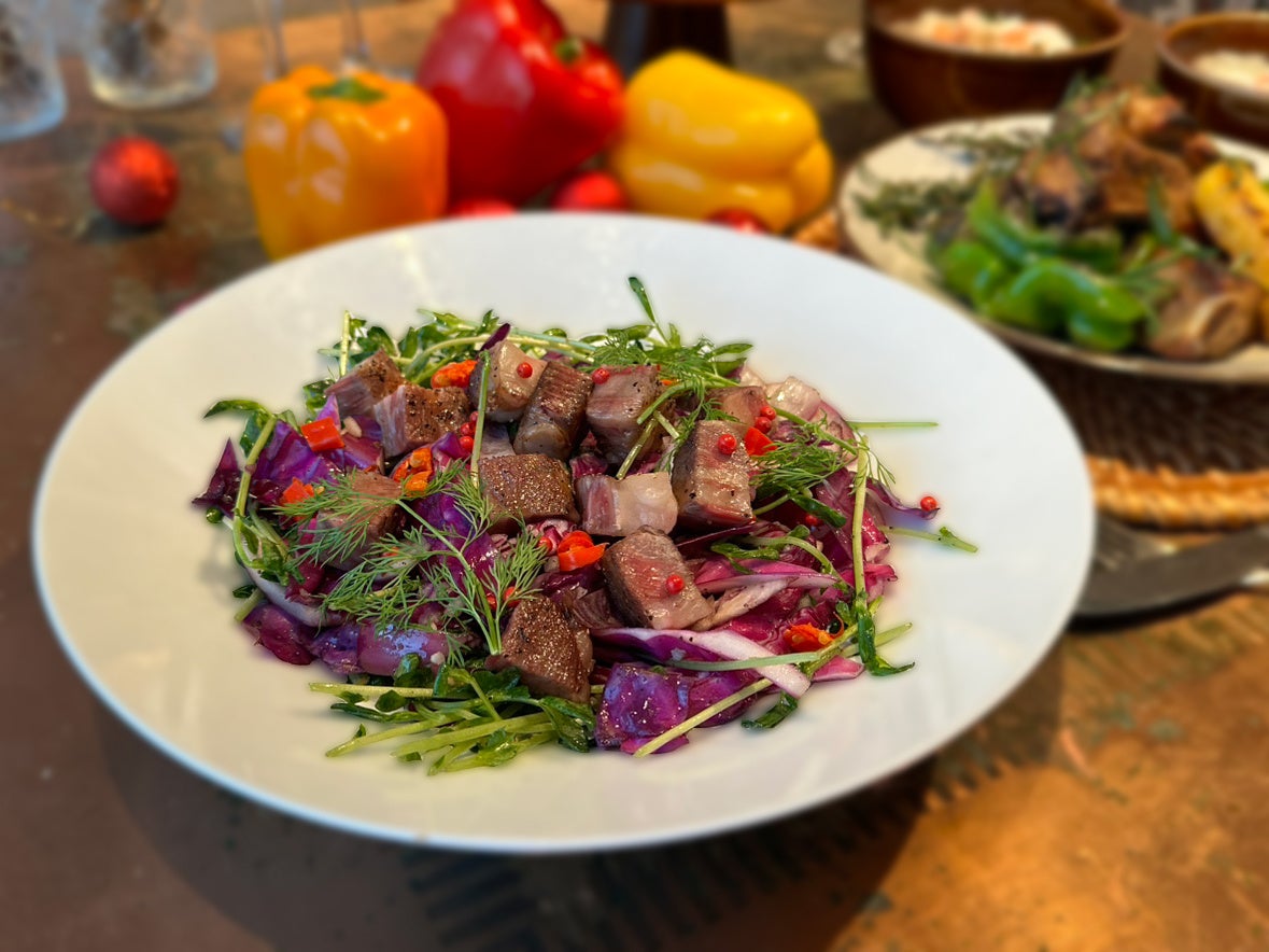 柔らかいリブロースとハーブをふんだんに盛り込んだ温かいサラダ