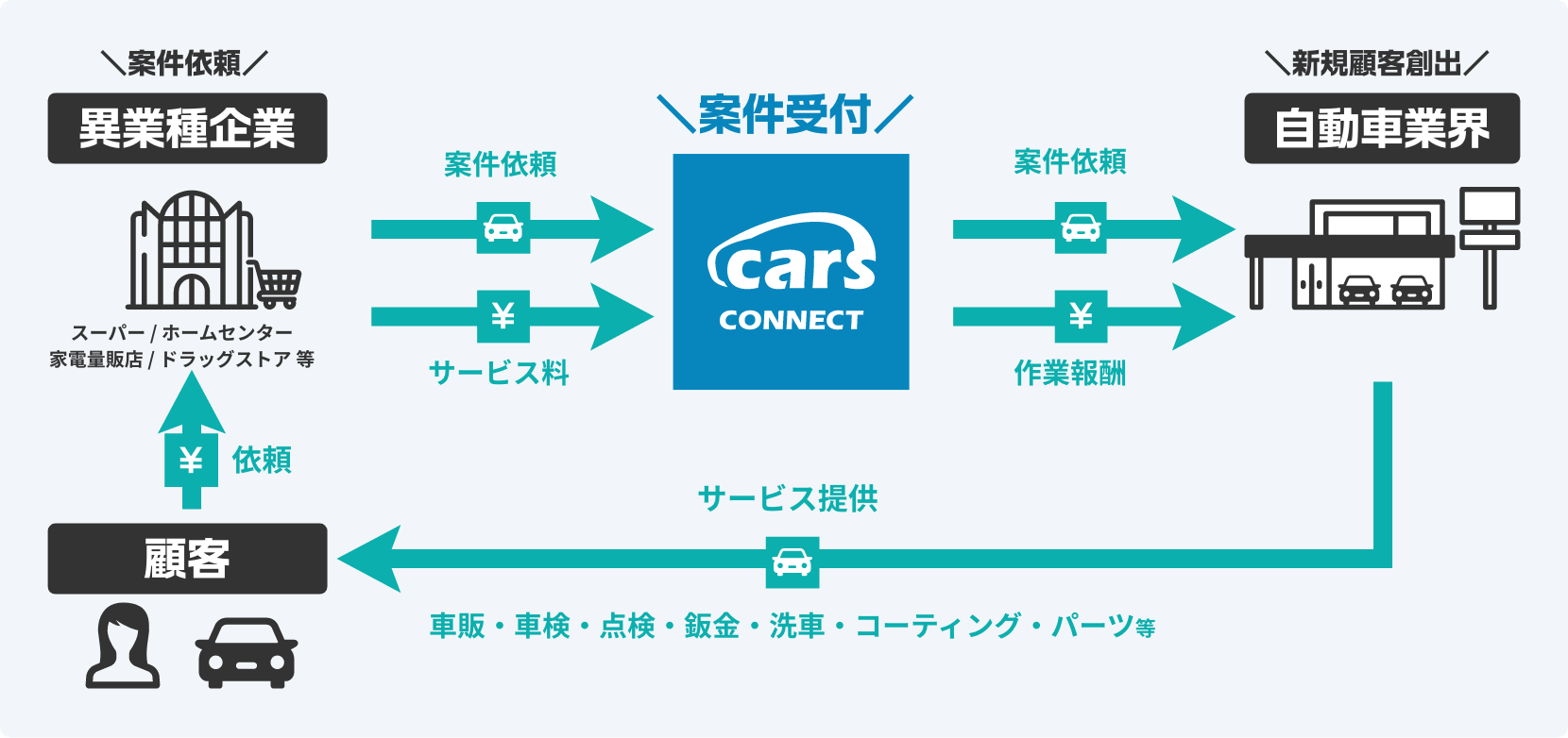 異業種企業と自動車業界とのcarsネットワークを活用した地域密着の異業種送客により、持続的な利益増・顧客増・効率増を実現します。