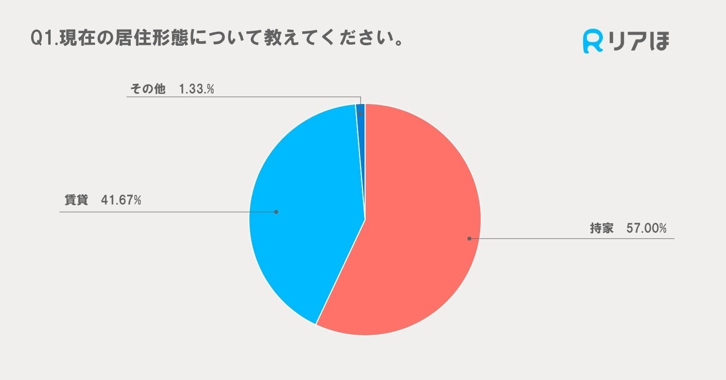 回答者の過半数が持家(57.00%)に住んでいることが明らかになりました。これに対し、賃貸に住んでいる人は41.67%で、持家がやや多い結果となっています。この結果から、持家が依然として主要な選択肢である一方で、賃貸を選ぶ人も少なくないことが分かります。