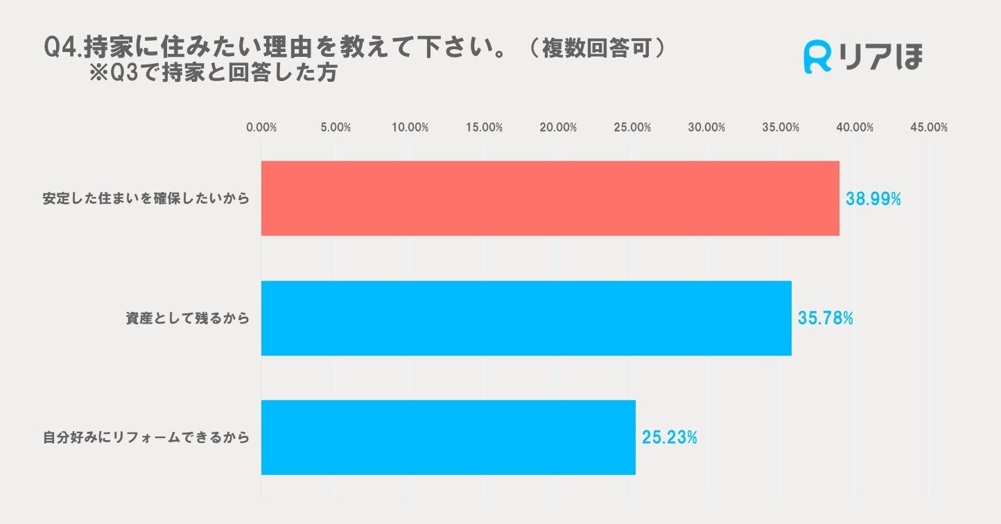 「安定した住まいを確保したいから」(38.99%)が最も多く選ばれており、多くの人が持家に安定性を求めていることが分かります。また、「資産として残るから」(35.78%)という理由も多くの人に選ばれており、長期的な視点で資産形成を意識している方が一定数いることも見受けられます。さらに、「自分好みにリフォームできるから」(25.23%)といった自由度を重視する声も多く見られ、持家の魅力が多角的に支持されていることがよくわかります。