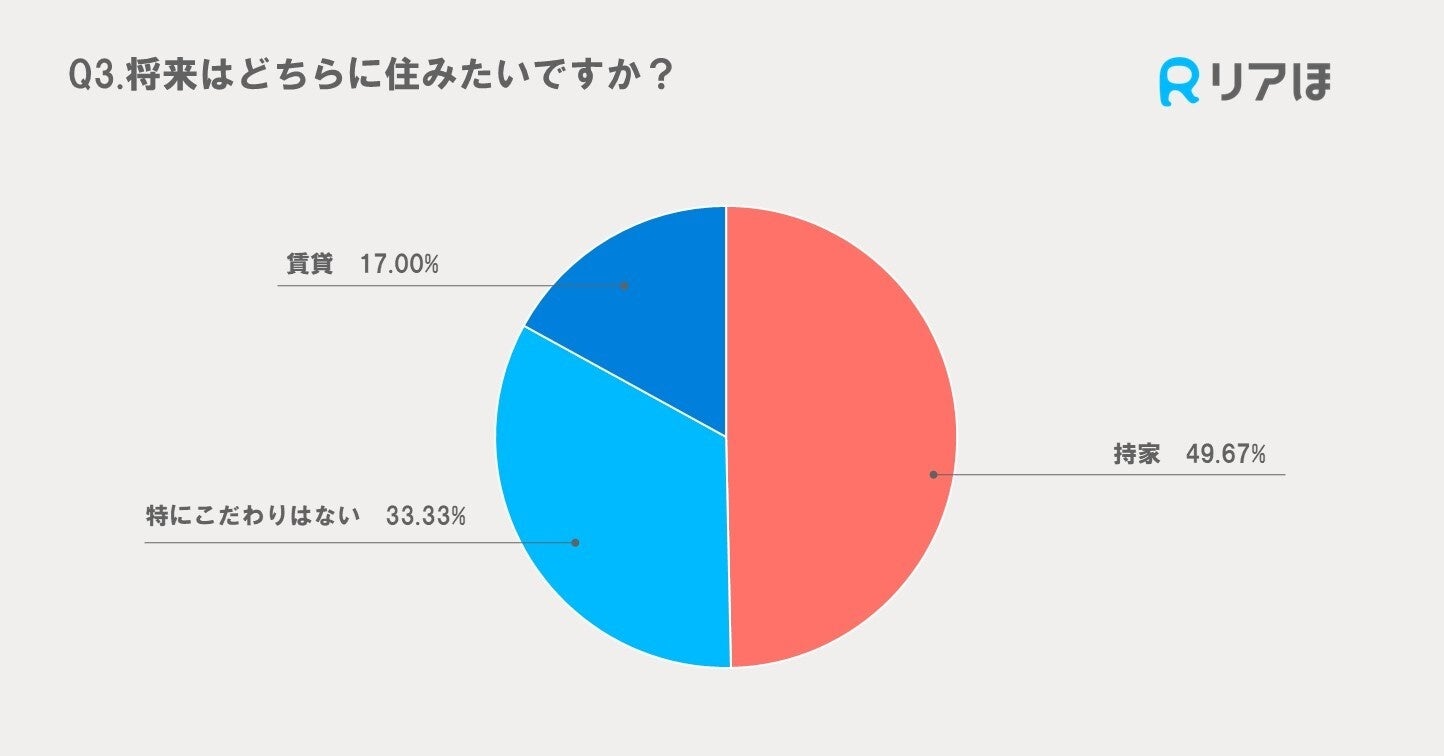 将来は「持家」を希望する方がほぼ半数と最も多い結果となりました。一方で、「特にこだわりはない」と回答した方も33.33%と一定数おり、住まいに対する柔軟な姿勢が伺えます。「賃貸」を選んだ方は17.00%であり、持家志向が強い結果となりました。