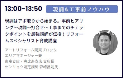 現場力を上げたいリフォーム営業マンの方、知識を深めたいリフォーム会社の向けに方専門新聞社が企画した現場力を向上させる特別講義です。現調から施工管理などの工務関連から、ヒアリングやプランといった提案関連、間取りや色といった基礎知識まで9つのテーマ(現調&工事ノウハウ、施工管理、ヒアリング、プランニング、見積もり、配色、間取り基礎、消費者トレンド、マーケット情報)全12講義で知識をカバーできる講座が準備されています。アートリフォームからは「現調&工事ノウハウ」について森崎(関東ブロックエリアマネージャー)が顧客から信頼され成約率が高まる現調ノウハウ「現調前準備」を、「施工管理」について谷口(関東ブロックエリアマネージャー)、白川(施工管理室室長代理)がクレーム&ミスが激減した施工管理ノウハウ「5つの掟」をお話します。