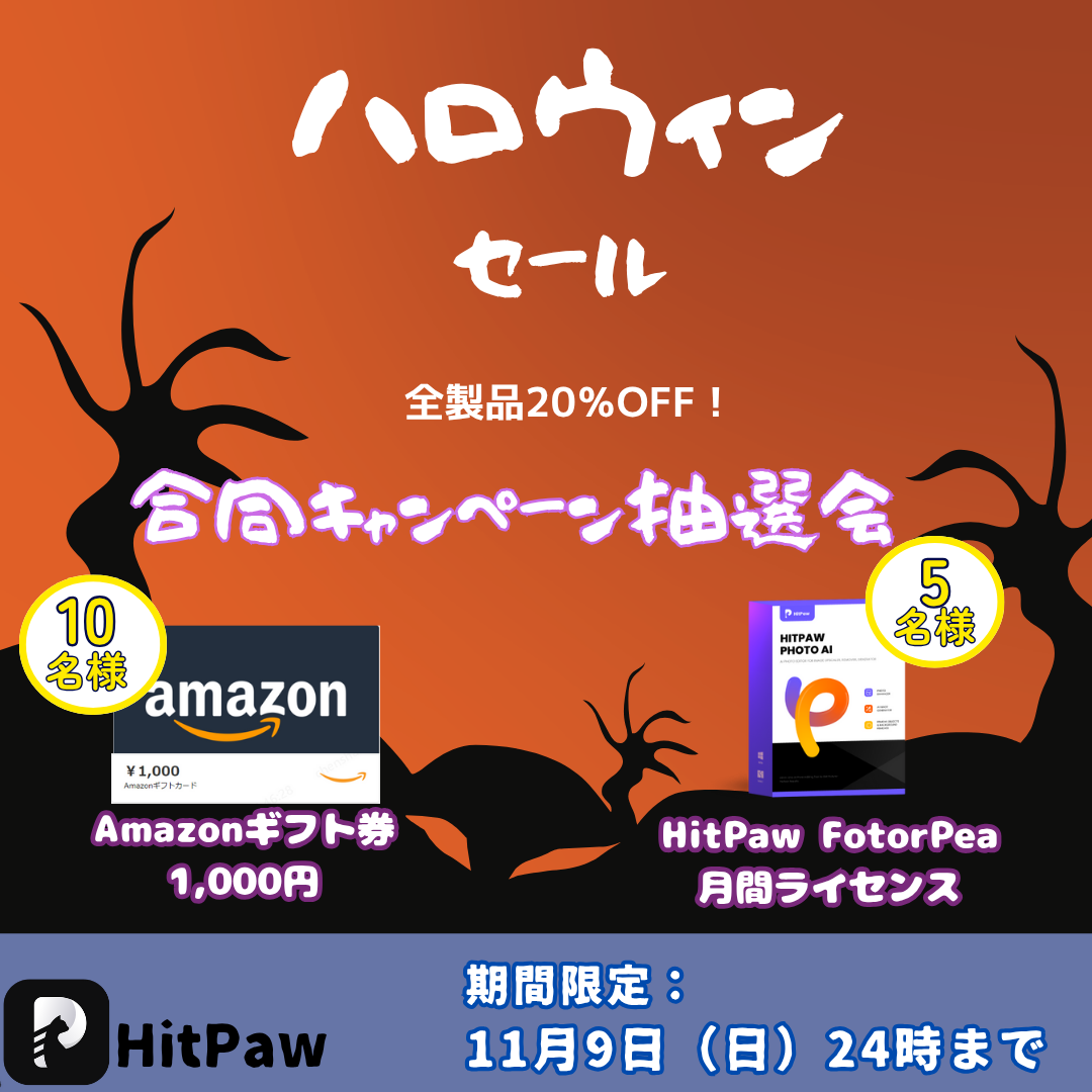 一年に一度のハロウィンがやってきました!日頃のご愛顧に感謝して、HitPawシリーズ製品では特別な期間限定セールを開催します。期間中、全製品20%OFF!さらに、抽選でAmazonギフトカードやHitPaw製品のトライアルライセンスが当たるチャンスも!この機会に、あなたのクリエイティブを解き放ちましょう✨