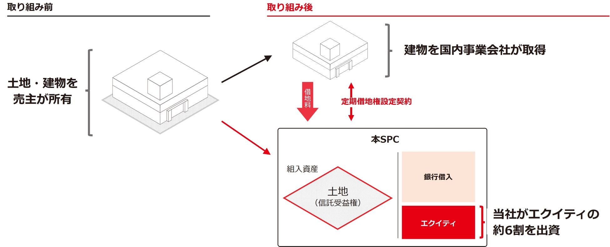 本件取り組みは、特別目的会社を用いたGK-TKスキームで、本SPCは商業施設「トコトコスクエア」の土地を組入資産とし、エクイティと銀行借入により資金を調達いたします。当社はエクイティの約6割を出資するメジャー出資者であり、建物所有者からの借地料をキャッシュ・フローの源泉として、出資比率に応じた利益分配金を得ます。