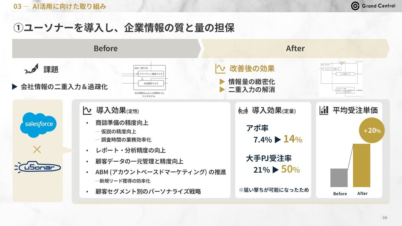 また、AI活用の前提となる「データ整備」の重要性も強調されました。“勝ちパターン”の分析(データ活用)を可能にするためのデータ蓄積が、劇的な成果向上につながったことが示されました。