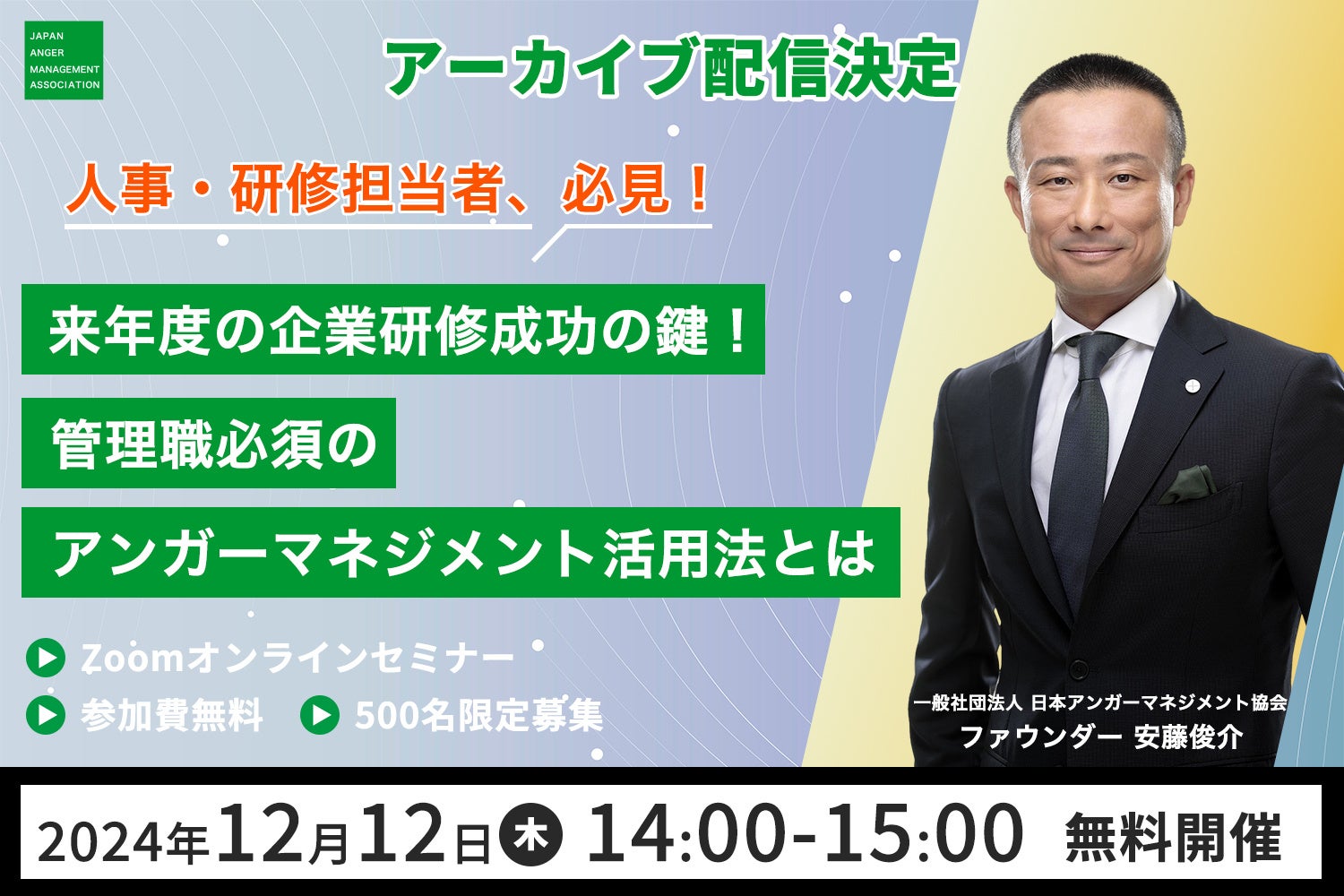この度、人事・研修担当者の方々にとって今後の企業研修のヒントとなるよう「来年度の企業研修成功の鍵!管理職必見のアンガーマネジメント活用法」セミナーをアーカイブ配信することとなりました。