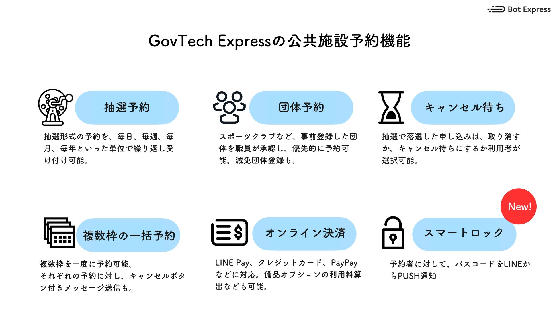 LINE公式アカウントの拡張ツール「GovTech Express」では、「抽選予約」「キャンセル待ち」「複数枠の一括予約」「複数席予約」「オンライン決済」などさまざまな機能を用意しています。今回新たに加わった「スマートロック連携機能」を利用することで、該当施設に職員を派遣する必要がなく、大きな業務改善に繋がることが期待できます。この施設予約機能は、自治体職員が利用する会議室等にも利用が可能です。