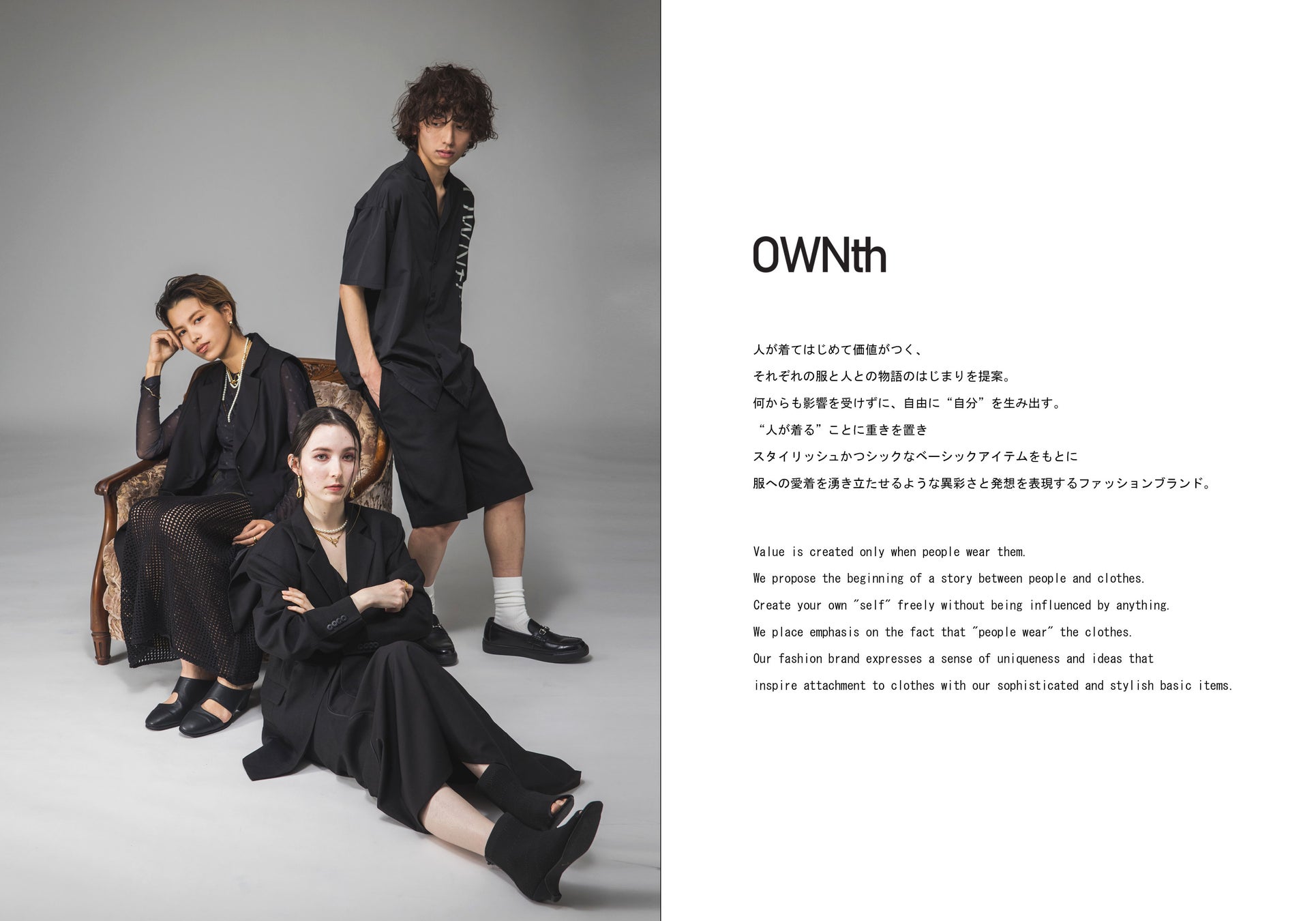 洋服は人が着てはじめて価値が生まれるもの。それぞれの服と着る人との物語のはじまりを提案するブランドが『OWNth(オンス)』です。何からも影響を受けずに、自由に“自分”を生み出せる服。“人が着る”ことに重きを置き、スタイリッシュかつシックなベーシックアイテムをベースに、服への愛着を湧き立たせるような異彩さと発想を表現して参ります。