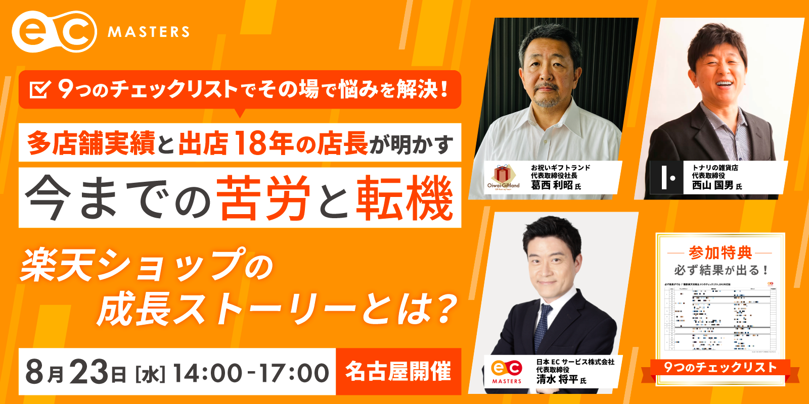 日本ECサービス株式会社は「ECマスターズクラブ」というネットショップのための会員制サポートサービスを運営しており、楽天ショップ約56,000ショップの25社に1社、日本全国2,400社以上、10,000人以上の会員様にご利用いただいております。コロナ禍も落ち着き昨年からリアル会場限定の「公開コンサルティング」を再開しています。今回は特別に楽天出店歴18年の「お祝いギフトランド」葛西利昭氏、国内外様々なブラントを扱うセレクト雑貨店の「トナリの雑貨店」西山国男氏をお招きしており、実際の楽天ショップ運営者の声も聞くことが出来ます。ネットショップ運営の日頃のお悩みを解決したり、近隣のショップ様とのネットワークを広げる場としても貴重な機会ですので、是非ご参加をお待ちしています。