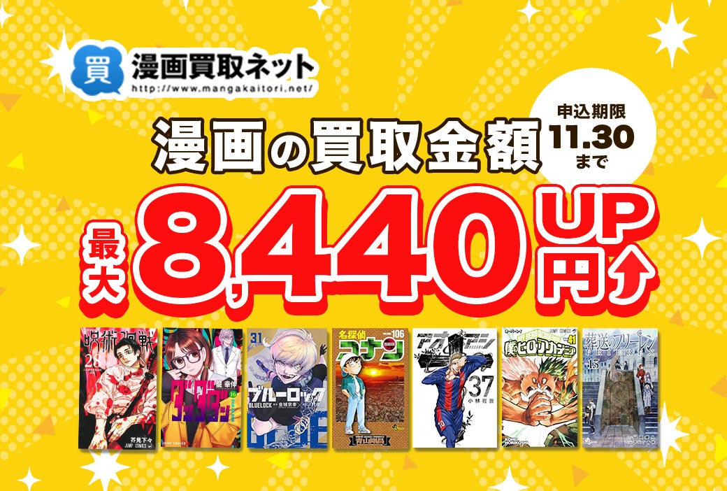 株式会社ブックサプライ(本社:大阪府吹田市、代表取締役:藪田真吾)が運営する漫画専門の買取サイト「漫画買取ネット」では、2024年11月1日(金)から2024年11月30日(土)まで、「超!高価買取 こんなに漫画が高く売れるのは今だけ!!」キャンペーン第6弾を開催いたします。