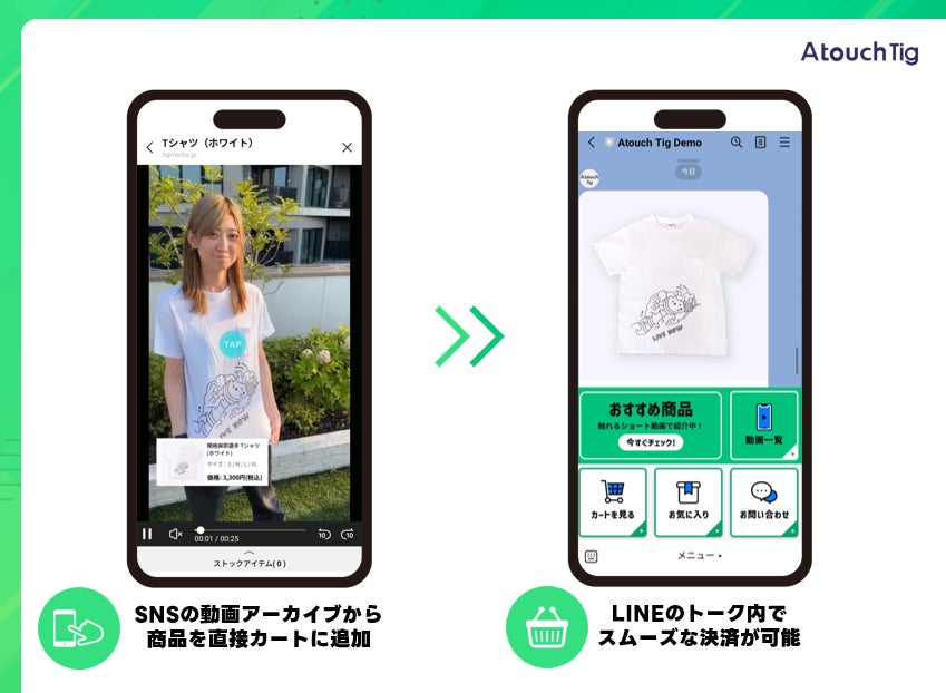 ユーザーは「Atouch」(LINEのトーク画面)で動画を見ながら、そのまま購入・決済できます。