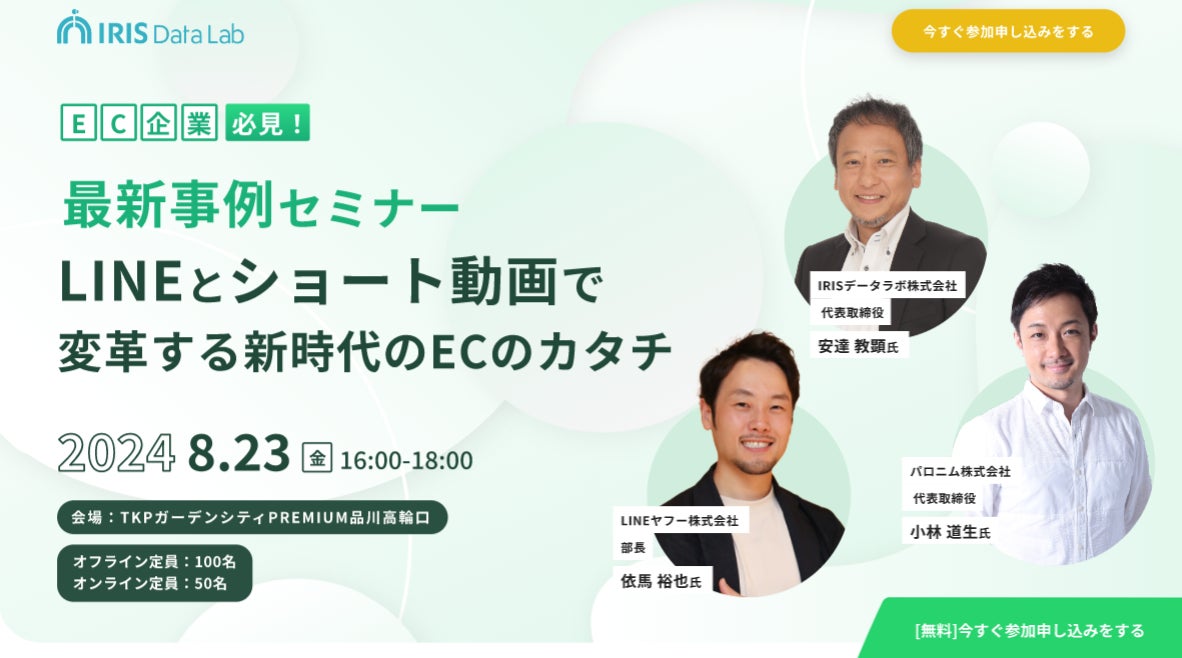 当日、小林氏はIRISデータラボ安達代表と共に登壇いただき、「動画時代のEC運用に最適!LINEコマース×ショート動画コマース時代の幕開け」のテーマでお話しいただきます。