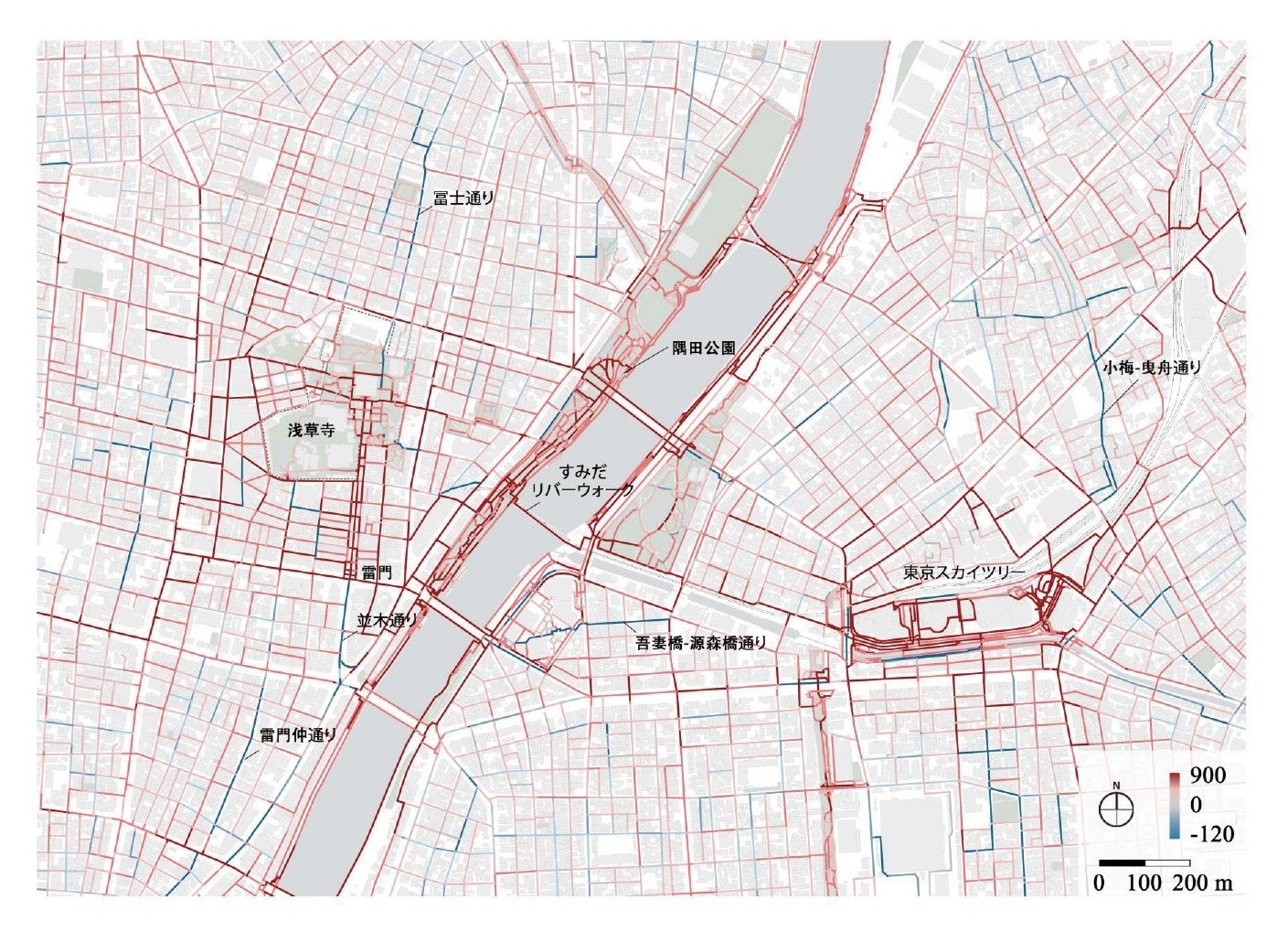 今回、この「街歩きインデックス」を用いて東京都の浅草・スカイツリー周辺の道路を分析しました。 よりスコアが高い道を赤、低い道を青で表現すると以下のようになりました。