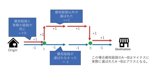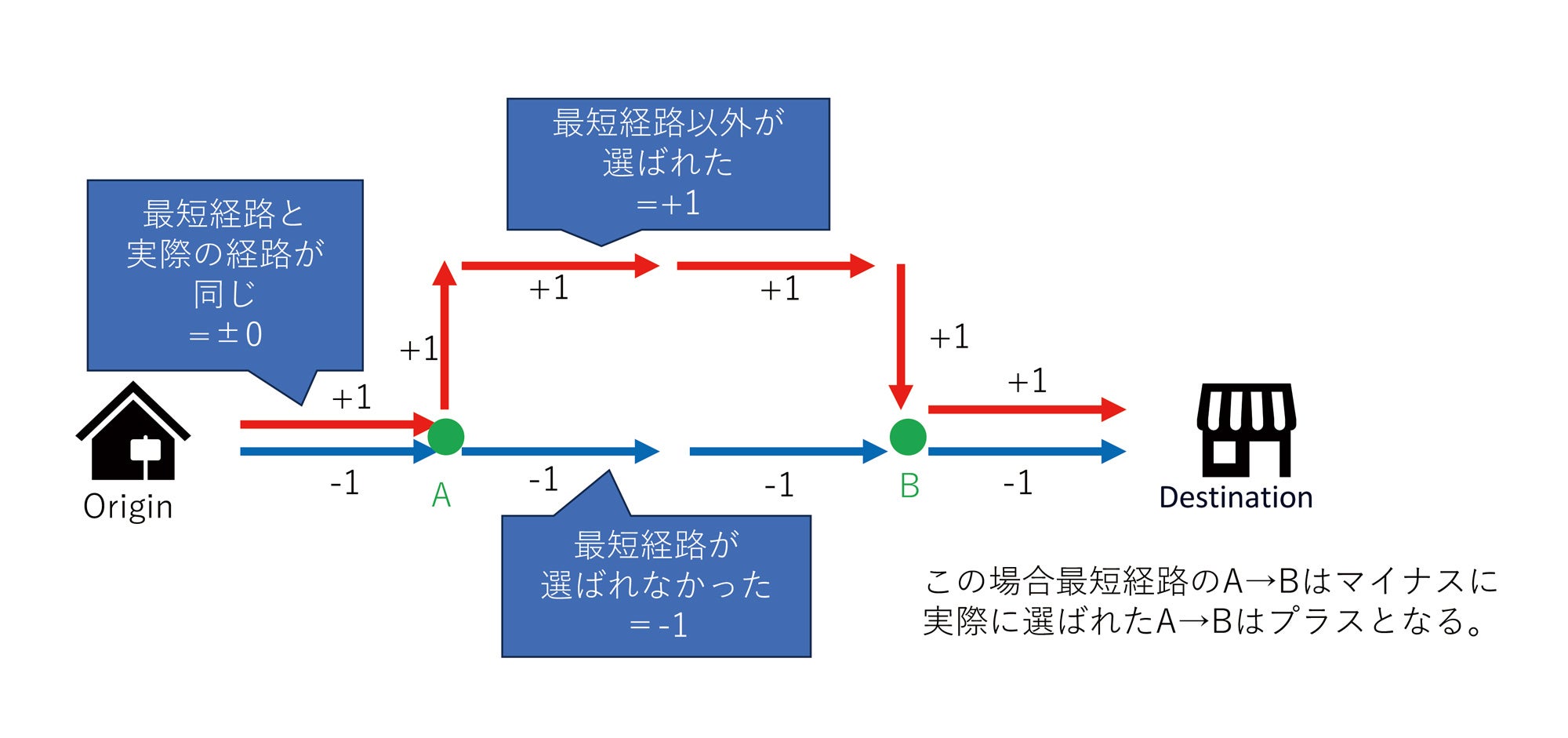 これらのような歩行経路の選択志向を可視化する仕組みとして、一つの歩行移動に対し、目的地への最短経路に-1点を、そして実際に選ばれた歩行経路に+1点を与えます。