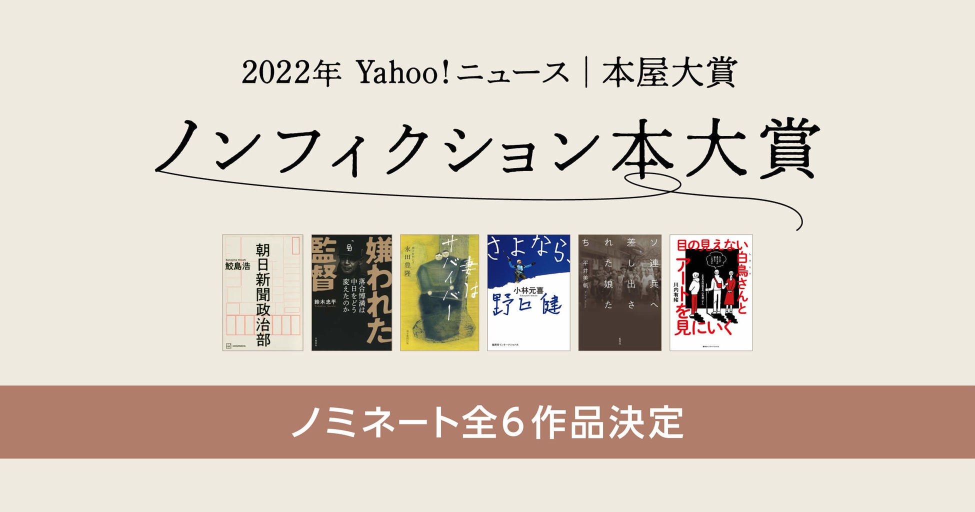 ヤフー株式会社が運営する日本最大級のインターネットニュース配信サービス「Yahoo!ニュース」と、全国の書店員がお客様に薦めたい本を投票して大賞を決定する「本屋大賞」は本日、「2022年 Yahoo!ニュース | 本屋大賞 ノンフィクション本大賞」(以下、「ノンフィクション本大賞」)にノミネートされた6作品を発表しました。今後、全国の書店員による投票を経て、11月上旬に大賞作品を発表します。