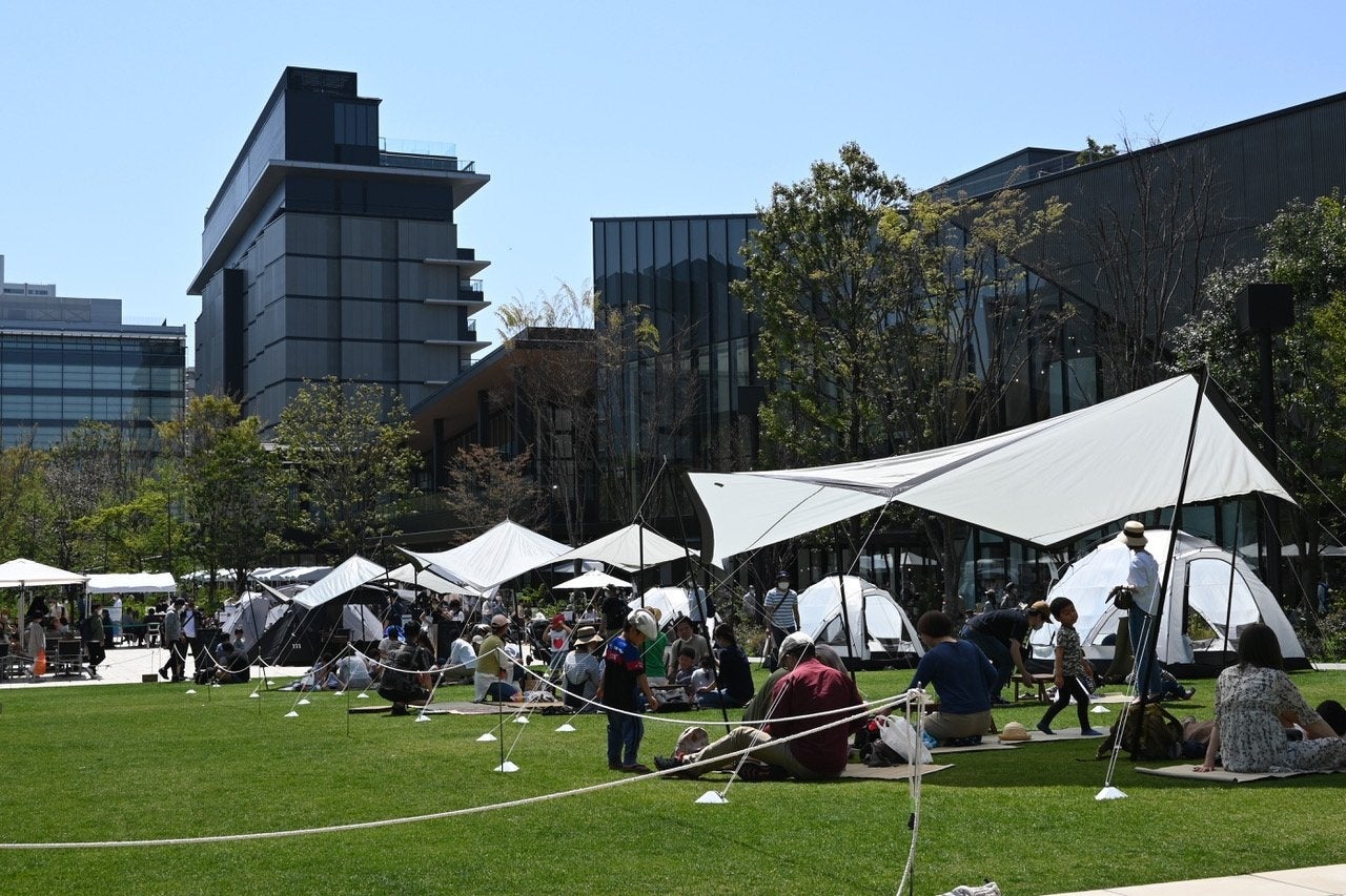 芝生広場は日本発のアウトドアブランドmuracoのタープ等が演出します。