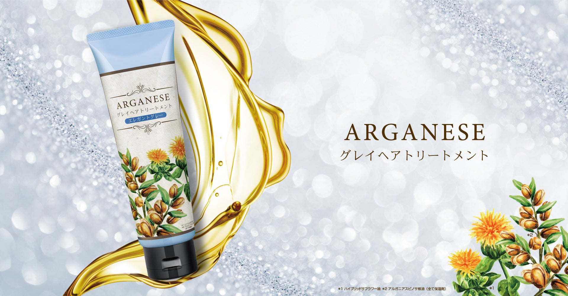 アルガネーゼシリーズ共通のアルガンオイルに加え、オイル成分を2倍配合*2。さらに、ツヤなし・パサつき等の年齢髪悩み対策に、贅沢に8種のオイルを配合しました。毛髪を補修しながら、年齢髪に不足しがちなツヤ感やうるおいを補って、ツヤツヤで上品なグレイヘアへ導きます。