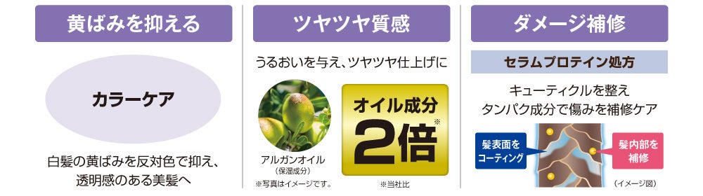 年齢髪悩み対策にアルガンオイルをはじめとした美髪オイルを配合。白髪の黄ばみを抑えるカラーとセラムプロテイン処方を採用し、ふんわりツヤツヤの仕上がりに。