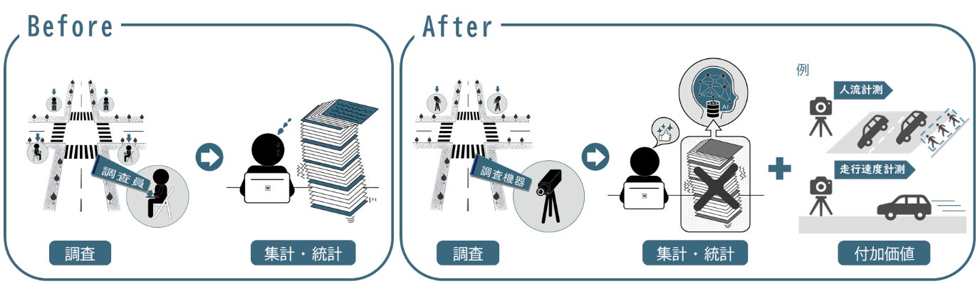 す。測定対象の交差点を4箇所選定し、時間帯別・方向別・車種別の車両台数を測定するとともに、交差点の事情に合わせた付加価値のデータの測定・分析を想定しています。