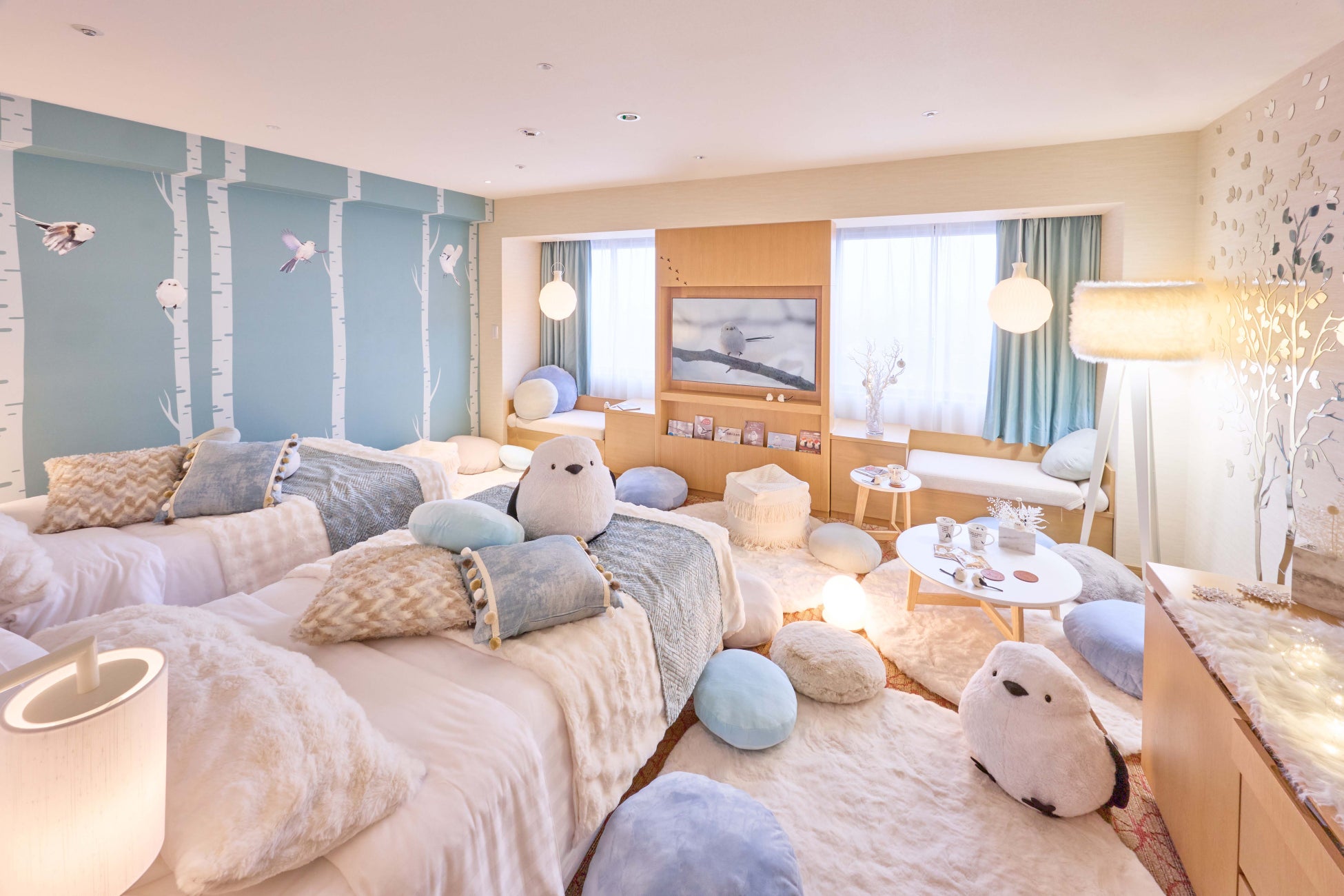 壁面はシマエナガが最も愛らしい姿を見せる「冬」を感じられるホワイト&ブルーカラーを基調とし、北海道らしい風景を落とし込んだイメージアートを配置。新たな魅力を加え、お部屋全体でシマエナガを感じていただける癒しの空間へと一新いたしました。