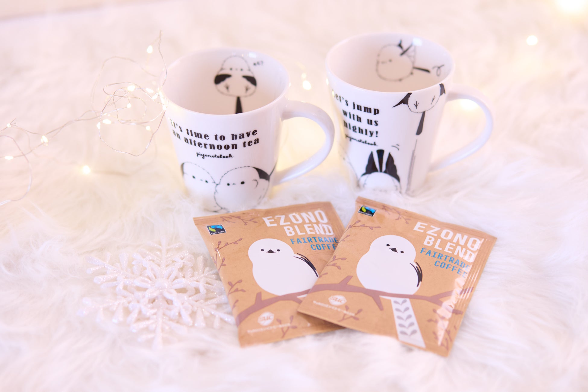 お部屋では北海道出身「ぴよ手帖」さんの愛らしいシマエナガイラスト入りマグカップや、同じく北海道出身の「shiroi maru」さんによる本物のサイズ感にこだわった毛糸ポンポンぬいぐるみ達がお客様をお出迎えいたします。