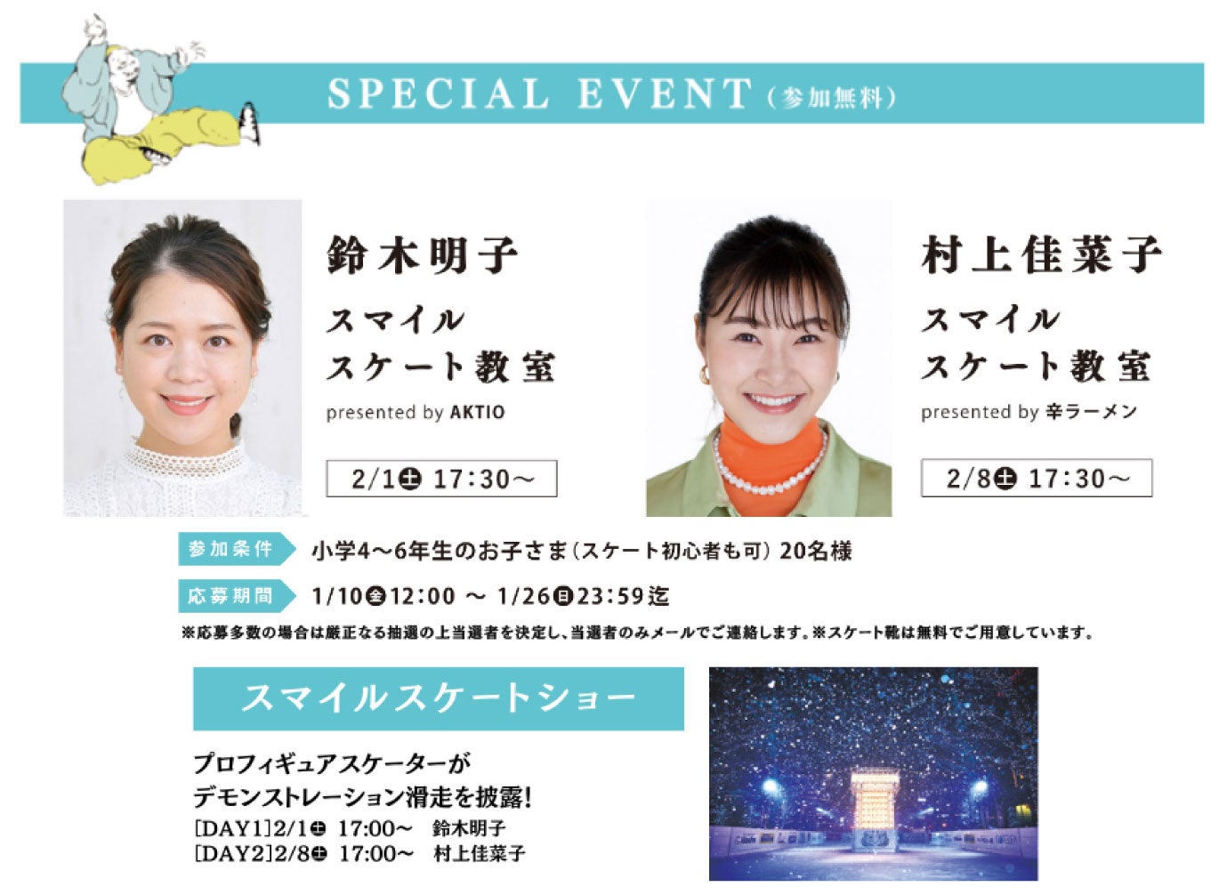 2月1日・8日には鈴木明子さん・村上佳菜子さんによるスケート教室も開催!