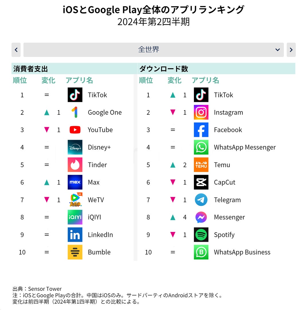 2024年第2四半期のトップアプリには、使い慣れたおなじみの製品が多数含まれています。TikTokは全世界の消費者支出とダウンロード数の両方でランキングのトップに立っています。その他のアプリはこれら両方の指標でトップ10にも到達していないことを考えると、これはなおさら特筆すべき点と言えます。ByteDanceが送り出した人気のあるソーシャルメディアアプリは、またしても全世界の1四半期当たり消費者支出の記録を更新し、2024年第2四半期に13億ドルを突破しました。これによってTikTokは、モバイルゲーム『Honor of Kings(王者荣耀)』に続いて、累計支出額が140億ドルを突破する史上2つめのアプリになりました。