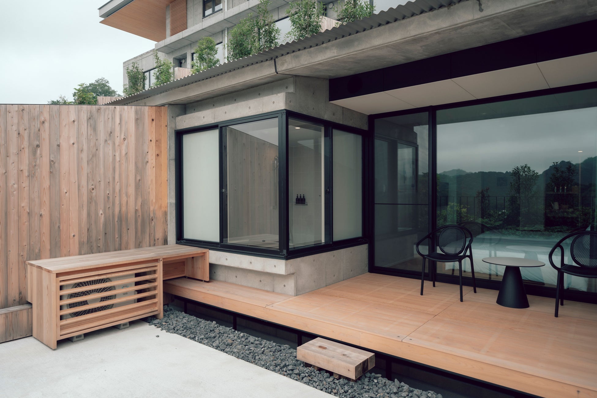 テラスツインルームは、客室と同等の広いテラスを設けた客室で、浴室の窓は2面開放可能となっており、贅沢な半露天の湯船をお楽しみいただけます。ダブルルームは、クイーンサイズのベッド1台を設置し、ホテル内で最大の窓を設けたお部屋で、多気の大自然をお楽しみいただけます。いずれもバスルーム、トイレ、洗面台が独立したつくりで使いやすい客室です。
