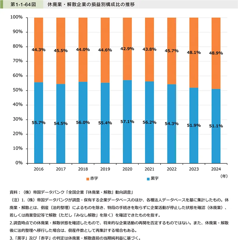 中小企業庁の調査(引用:2025年版 小規模企業白書)によると、休廃業・解散に至った企業のうち、2024年でも51.1%が「黒字」の状態で事業を終えています。これは、利益は出ているにもかかわらず、急な支払いや売掛金の入金遅延により資金がショートしてしまう「黒字倒産」や「黒字廃業」予備軍が数多く存在することを示しています。