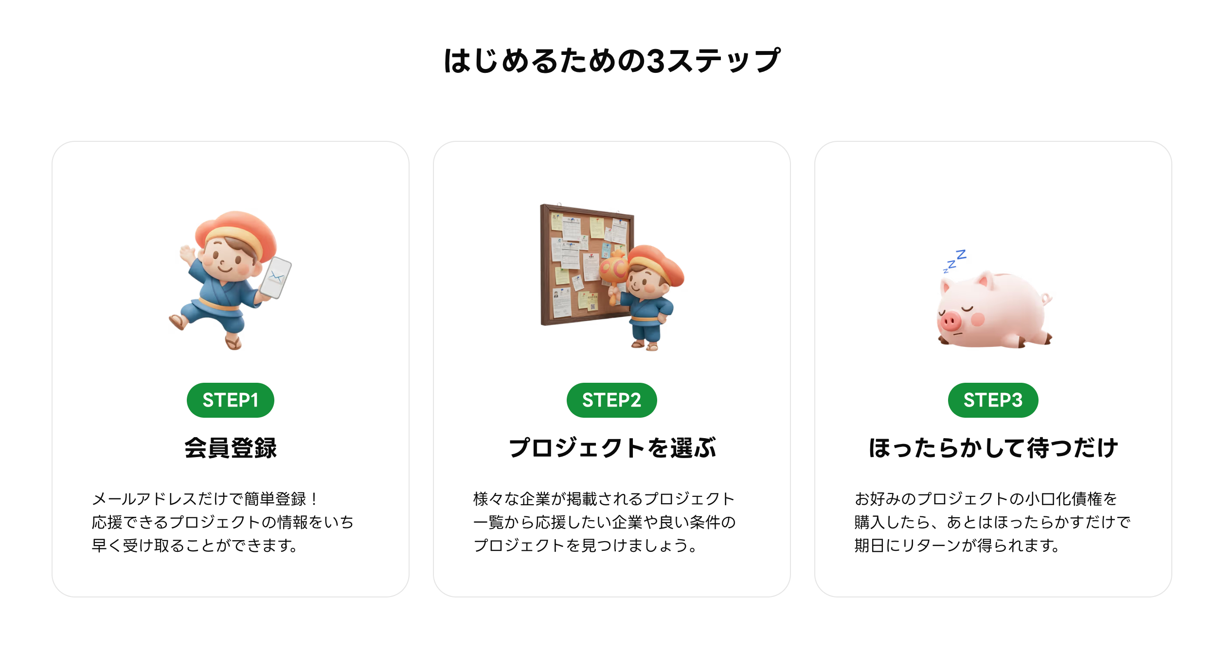 事前の信用調査を経て登録された売掛債権は、簡単に購入することができます。小口化したプロジェクトの募集金額が設定金額を上回った場合、プロジェクトが有効になり、プロジェクトの期間が満期を迎えるとリターンが入金されます。