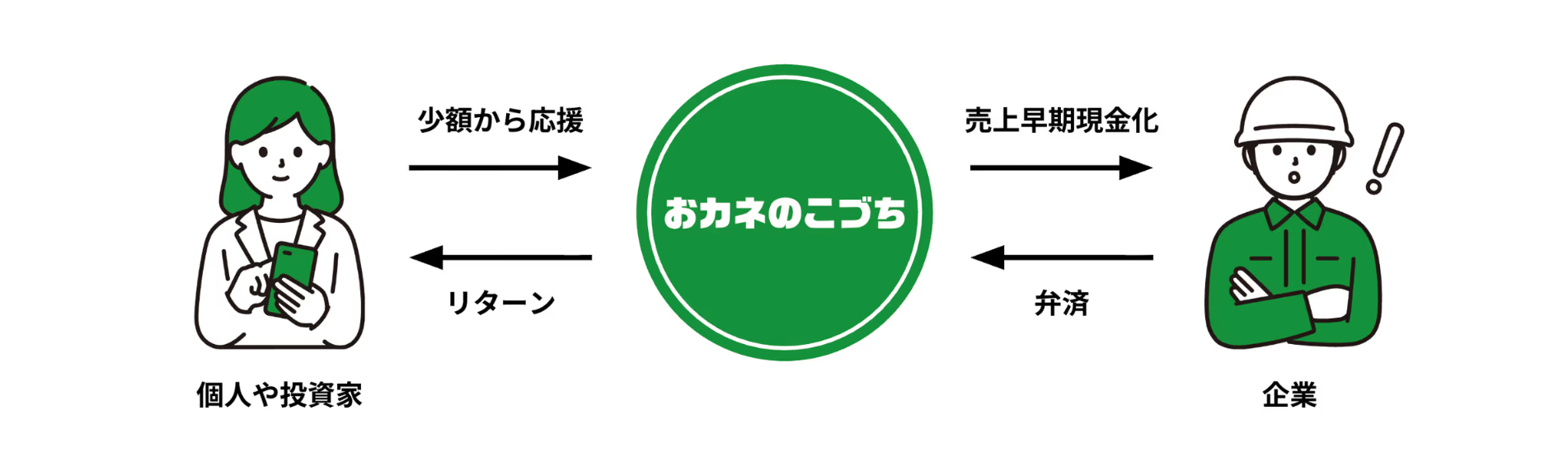 「おカネのこづち」は、この「資金繰りに悩む企業」と「社会貢献を望む投資家」の二つの課題とモチベーションを結びつけるプラットフォームになります。