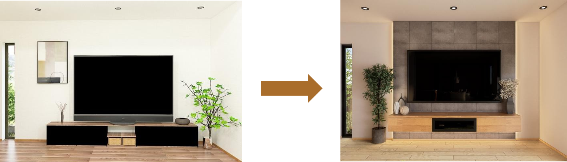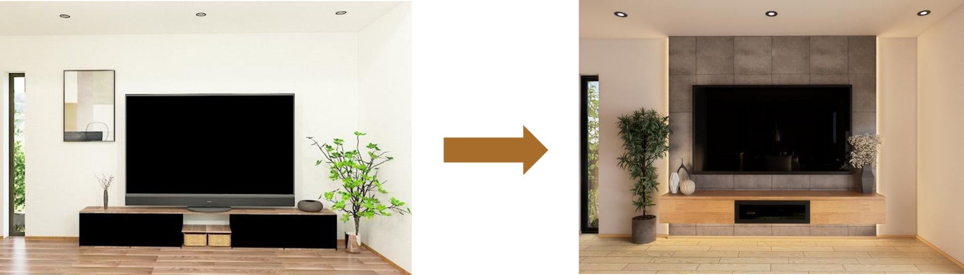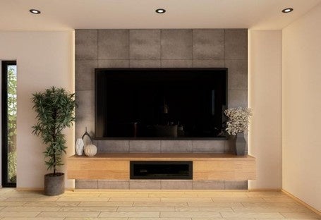 「日常に“映える”暮らし」をテーマに、住まいのテイストやライフスタイルに合わせて、TV周りを自分好みにカスタマイズできます。正面壁はオプションで、無垢調や石目調の壁に変更することも可能です。