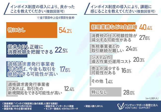 また、インボイス制度導入後、経理業務量の増加や消費税の仕入税額控除の減少など、企業の負担が増えていることが明らかとなった。