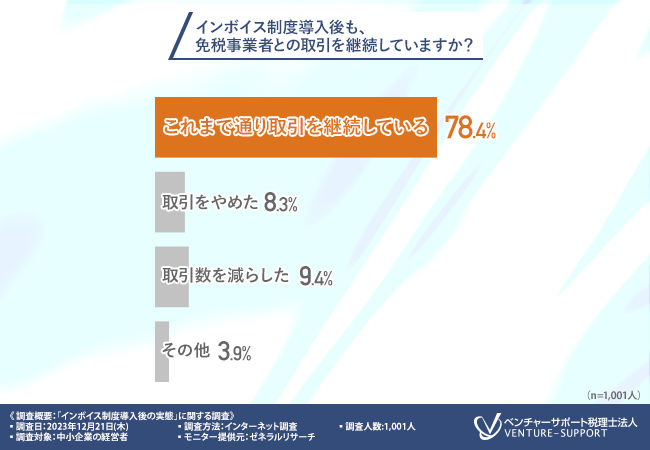 「インボイス制度導入後も、免税事業者との取引を継続していますか?」と質問したところ、「これまで通り取引を継続している(78.4%)」「取引をやめた(8.3%)」「取引数を減らした(9.4%)」「その他(3.9%)」と回答した。