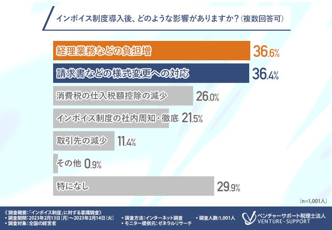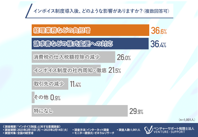 「インボイス制度導入後、どのような影響がありますか?(複数回答可)」と質問したところ、「経理業務などの負担増 (36.6%)」「請求書などの様式変更への対応(36.4%)」「消費税の仕入税額控除の減少(26.0%)」「インボイス制度の社内周知・徹底(21.5%)」「取引先の減少(11.4%)」「特になし(29.9%)」という結果となった。