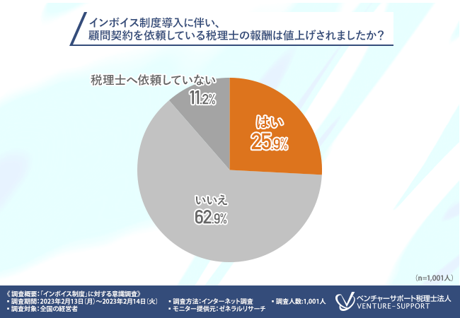 最後に、「インボイス制度導入に伴い、顧問契約を依頼している税理士の報酬は値上げされましたか?」と質問したところ、「はい(25.9%)」「いいえ(62.9%)」「税理士へ依頼していない(11.2%)」という結果になった。