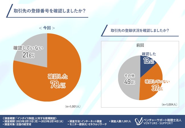 「取引先の登録番号を確認しましたか?」と質問したところ、「確認した(78.4%)」「確認していない(21.6%)」という回答結果になった。