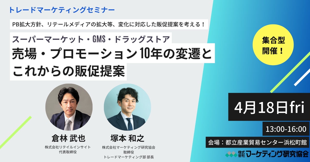 株式会社マーケティング研究協会は2025年4月18日、会場集合型セミナー「売場・プロモーションの変遷とこれからの販促提案 ~スーパーマーケット・GMS・ドラッグストア~」を開催する。