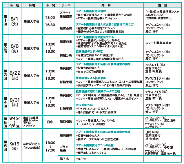 スマート農業技術の概況や導入事例に加え、経営課題の分析や収支計画、投資判断の考え方も併せて学び、個別相談を通じて受講者が導入プランを作成する実践的な内容です。