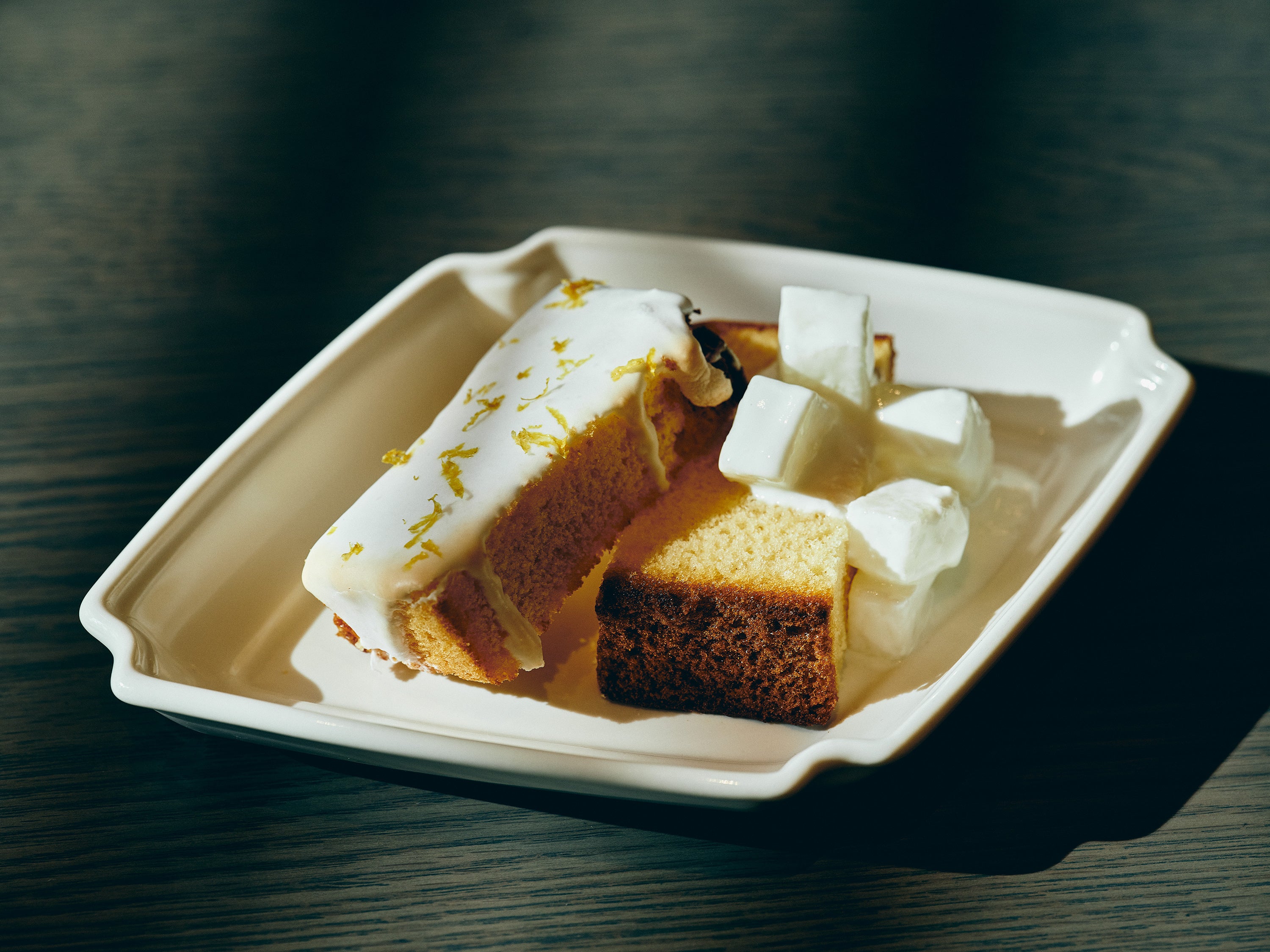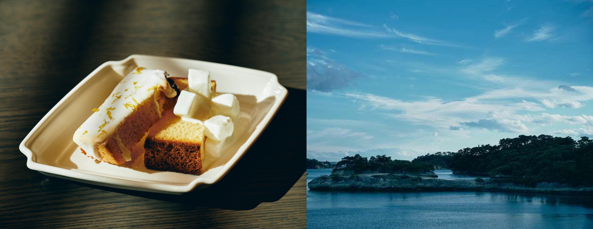 希少な日本みつばちの蜂蜜とレモンピールでコーティングした利府梨カステラ(写真左)と、今が旬の利府梨をたっぷり加えたヨーグルトソースを添えたひんやり仕立ての利府梨カステラ(写真右)。