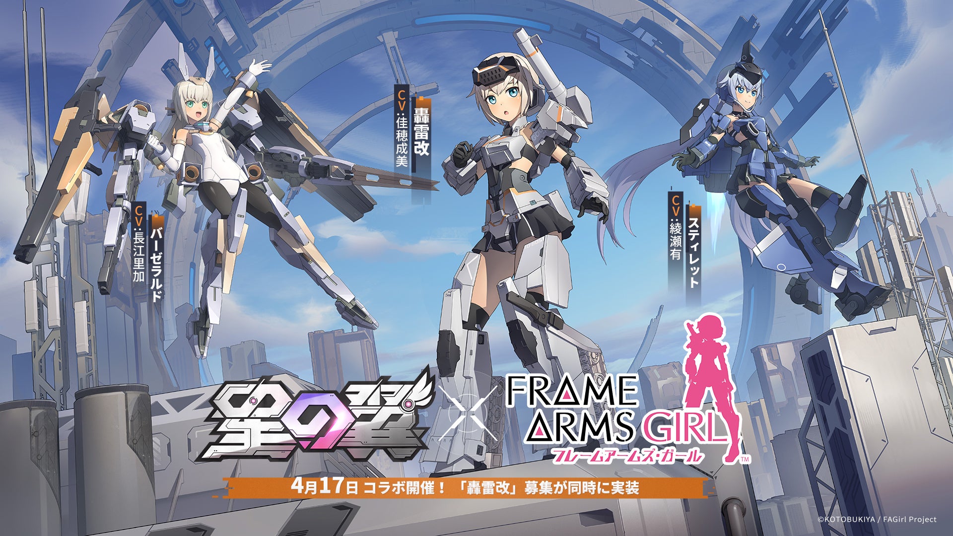 ホビーメーカー株式会社壽屋(本社:東京都立川市/代表取締役社長:清水一行)は、当社が原作のアニメ『フレームアームズ・ガール』と、Game Blender Studioが開発し、Shengtian Gamesが配信するメカ美少女2V2格闘ゲーム『星の翼』とのコラボイベントが4月17日(木)より開始されたことをお知らせいたします。