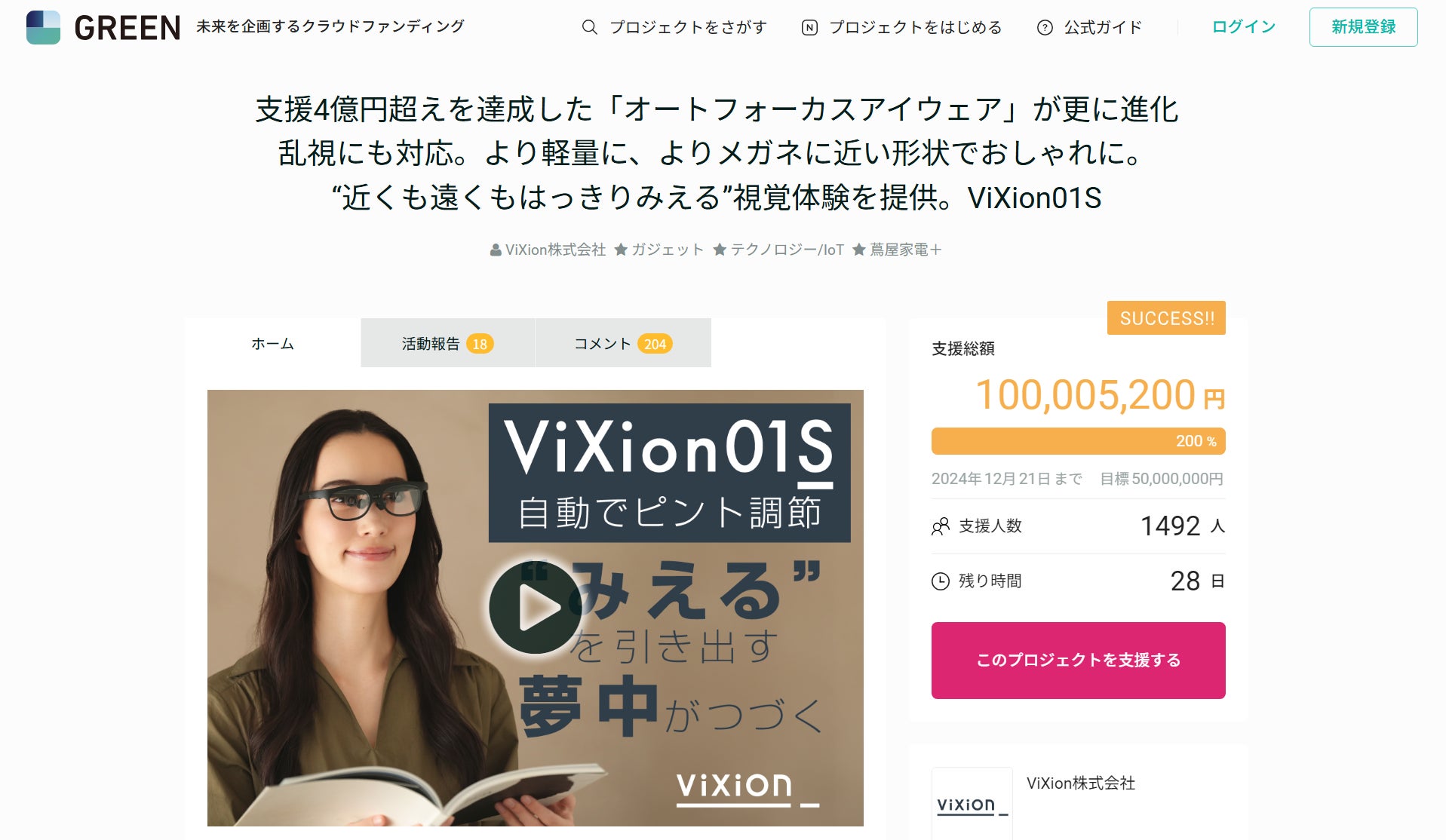 【支援総額1億円突破!】オートフォーカスアイウェア「ViXion01S」クラウドファンディングが大きな節目を達成