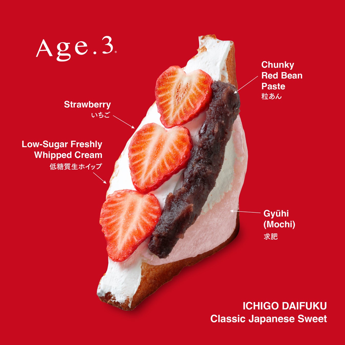 さらに、Age.3の代名詞である低糖質生ホイップクリームが全体をやさしく包み込み、甘さを抑えた軽やかな口どけが、苺とあんこの輪郭を引き立てます。