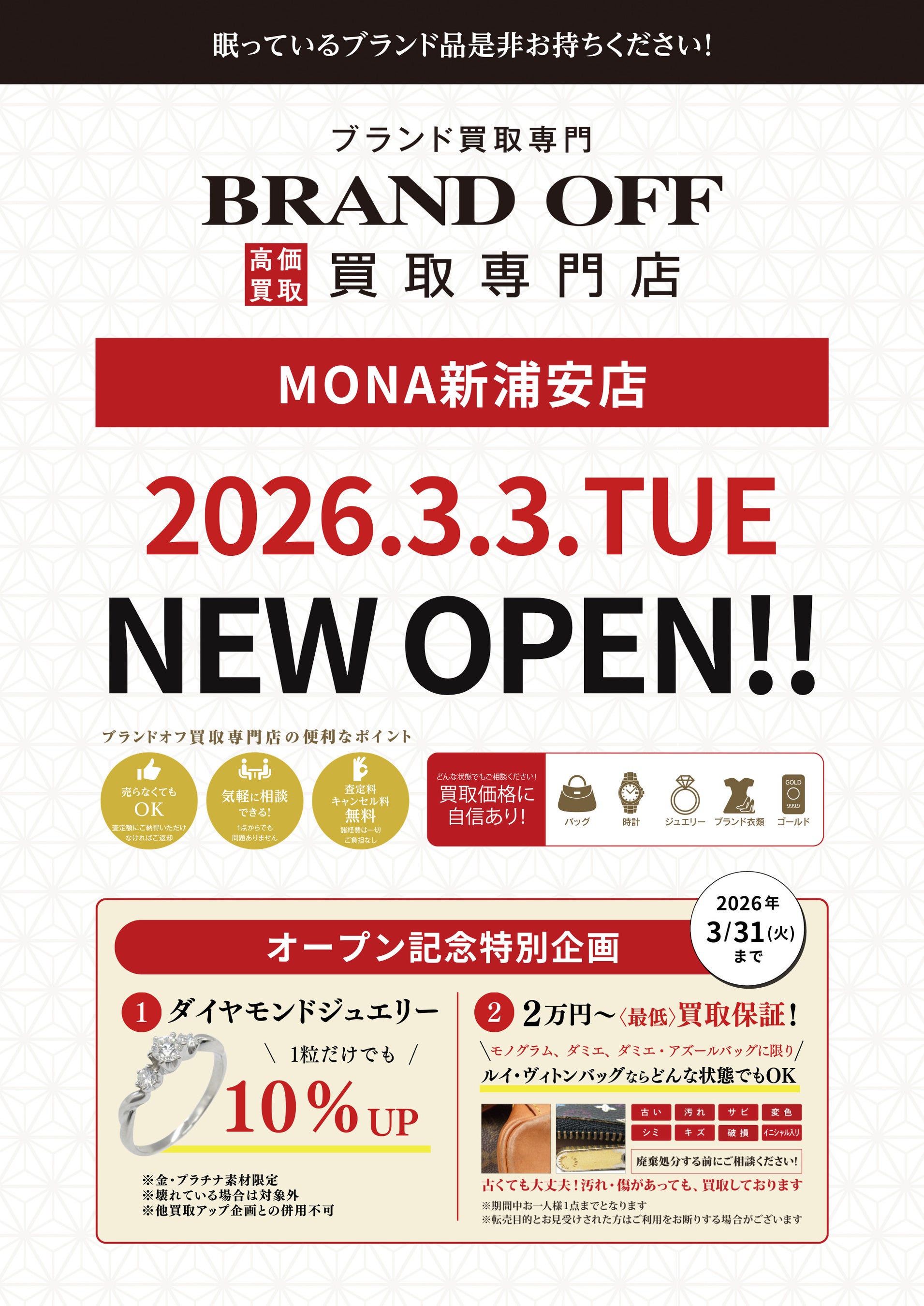 「ブランド買取専門店 BRAND OFF MONA新浦安店」が千葉県浦安市に3月3日(火)グランドオープン